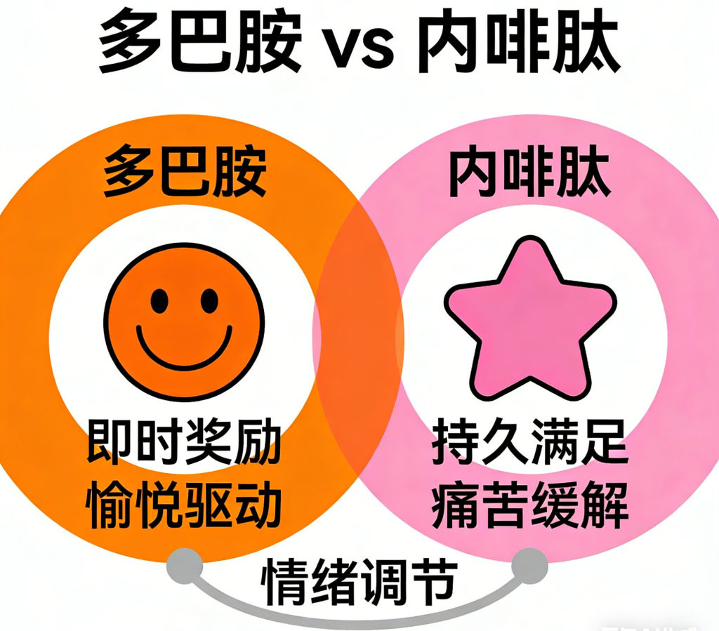 首先,我们来做个简单的脑内化学物质区分。很多人误以为多巴胺是“快乐物质”,其实更准确的描述是:多巴胺是“期待奖赏”的预告员,而内啡肽才是“获得成就”后的奖励本身